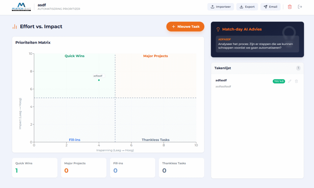 Met de AI prioritizer is het eenvoudig om prioriteiten aan te brengen binnen projecten. Het werkt op basis van impact vs effort. Als iets heel veel impact heeft maar weinig effort kost dan is het een quick win en zou je dat dus als eerste moeten aanpakken. Voor de AI strategie zijn we op zoek naar die processen.