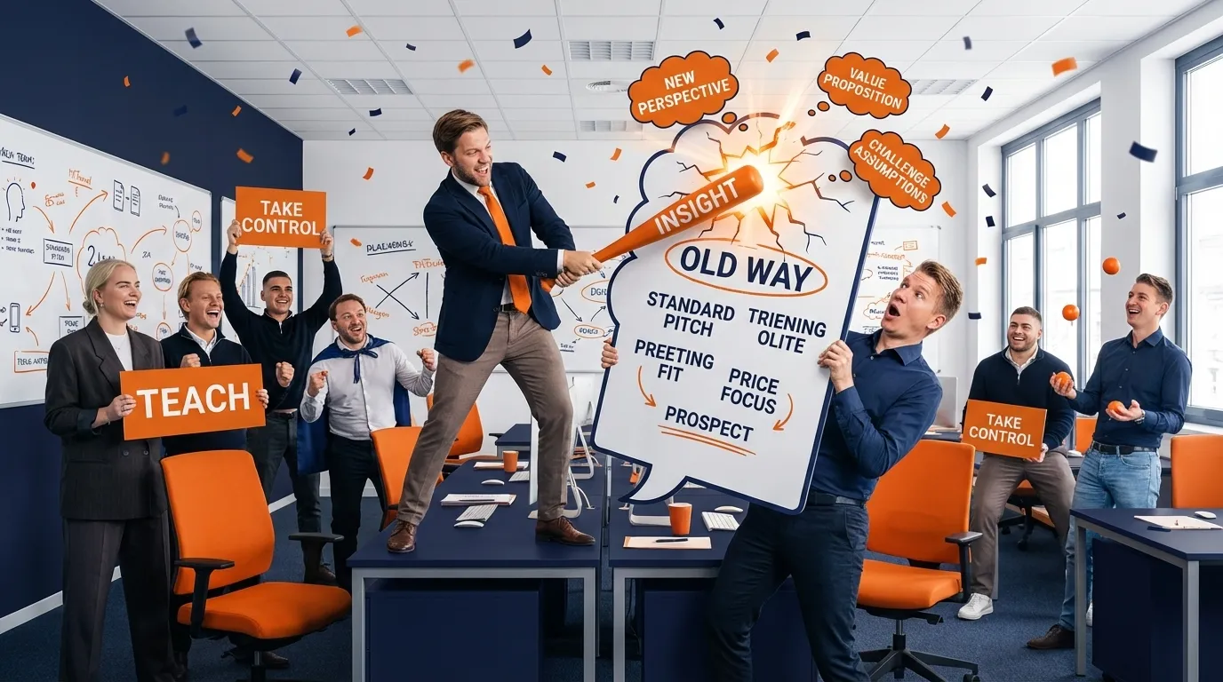 Traditional: "Tell me about your sales challenges." Challenger: "Based on 100+ companies in your sector, we see 70% focus on more leads, while the real problem is conversion. Your conversion data suggests the same - investing in more leads would be wasteful."