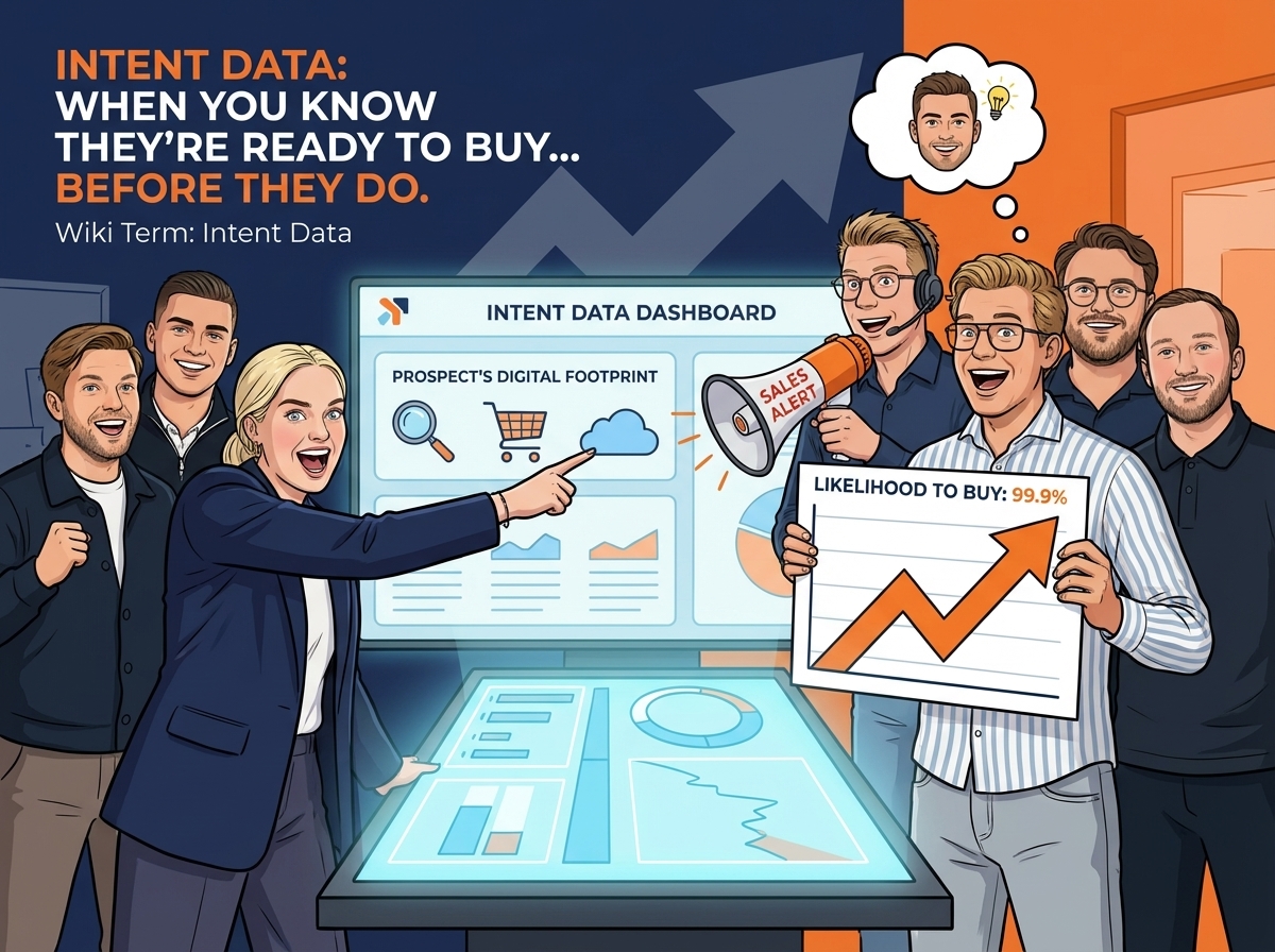 Intent data shows buying signals from prospects before they contact you. It's collected by tracking which content they consume (whitepapers, comparison sites), which search terms they use, which competitors they look at, and which events they attend. There are two types: first-party intent (behavior on your site - which pages, how often) and third-party intent (behavior on the broader web via platforms like Bombora or 6sense). Intent data helps you with timing - you approach accounts when they're actively in-market, not when they randomly end up in your cadence. This can increase your conversion by 3-5x vs blind outbound. It's especially powerful for ABM - you can see which of your target accounts show buying behavior.