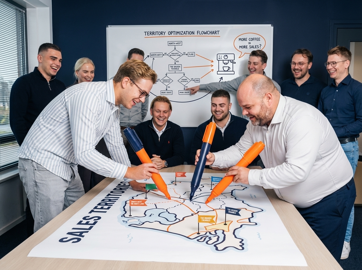 Sales territory management is about smartly dividing your market. You can divide by geography (province, region, country), industry (construction, healthcare, tech), company size (SMB, enterprise), or product (you sell multiple products). The goal: each salesperson gets a clear area with enough potential to hit targets, without people stepping on each other's toes. A good territory plan prevents conflicts ("that customer is mine!") and ensures every prospect is covered. You calculate the potential of each territory by doing: number of companies in your ICP × average deal size × expected conversion. If a territory has €2 million potential and your target is €500K, you know it's achievable. With geographic division, watch travel time: a salesperson in Utrecht can do Amsterdam and Utrecht, but not also Groningen. With industry division, ensure your salespeople build domain knowledge: someone who sells healthcare becomes an expert in healthcare. Territory management isn't static: every 6-12 months you check if the division still works based on results and market changes.